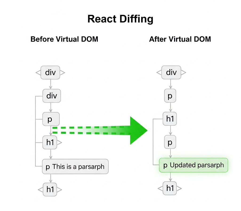Diffing 과정에서 발견된 변경 사항을 실제 DOM에 적용하는 최적화된 과정을 Reconciliation이라고 합니다. React는 p 태그의 텍스트 내용만 변경하면 된다는 것을 파악하고, 불필요한 DOM 조작을 방지합니다.