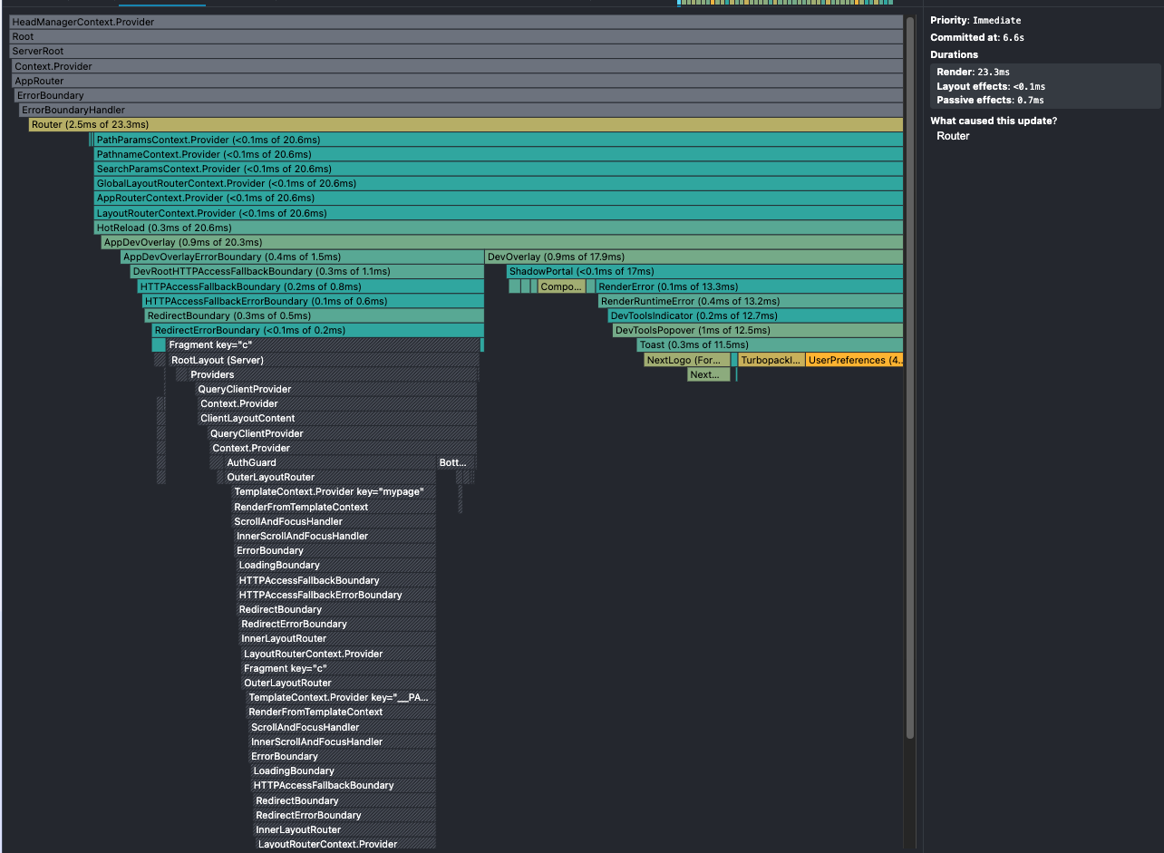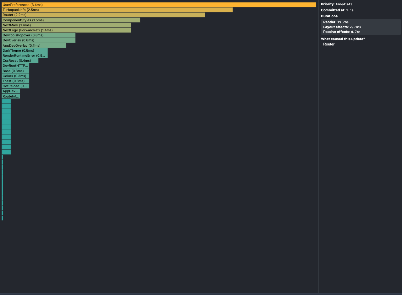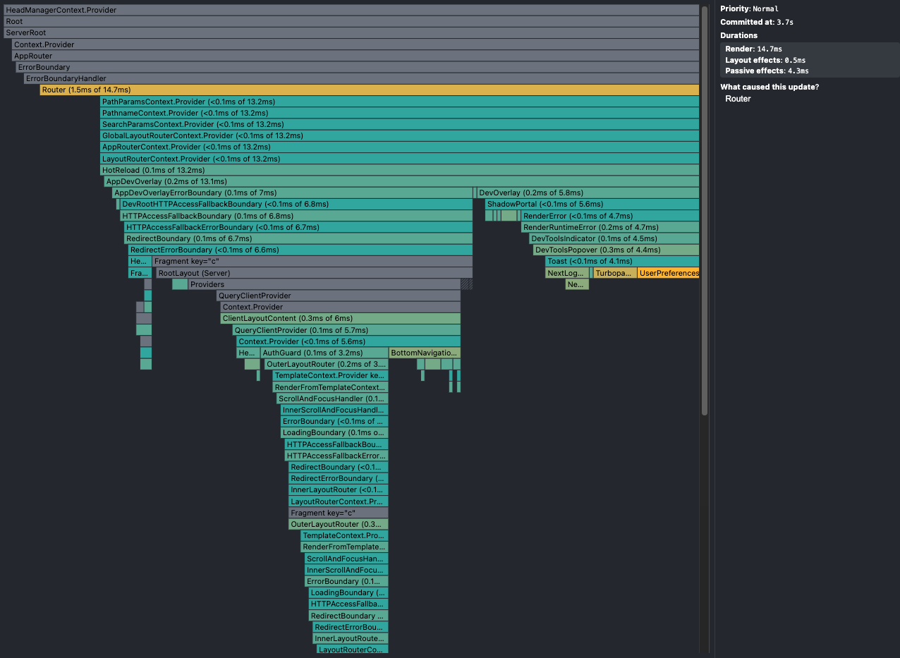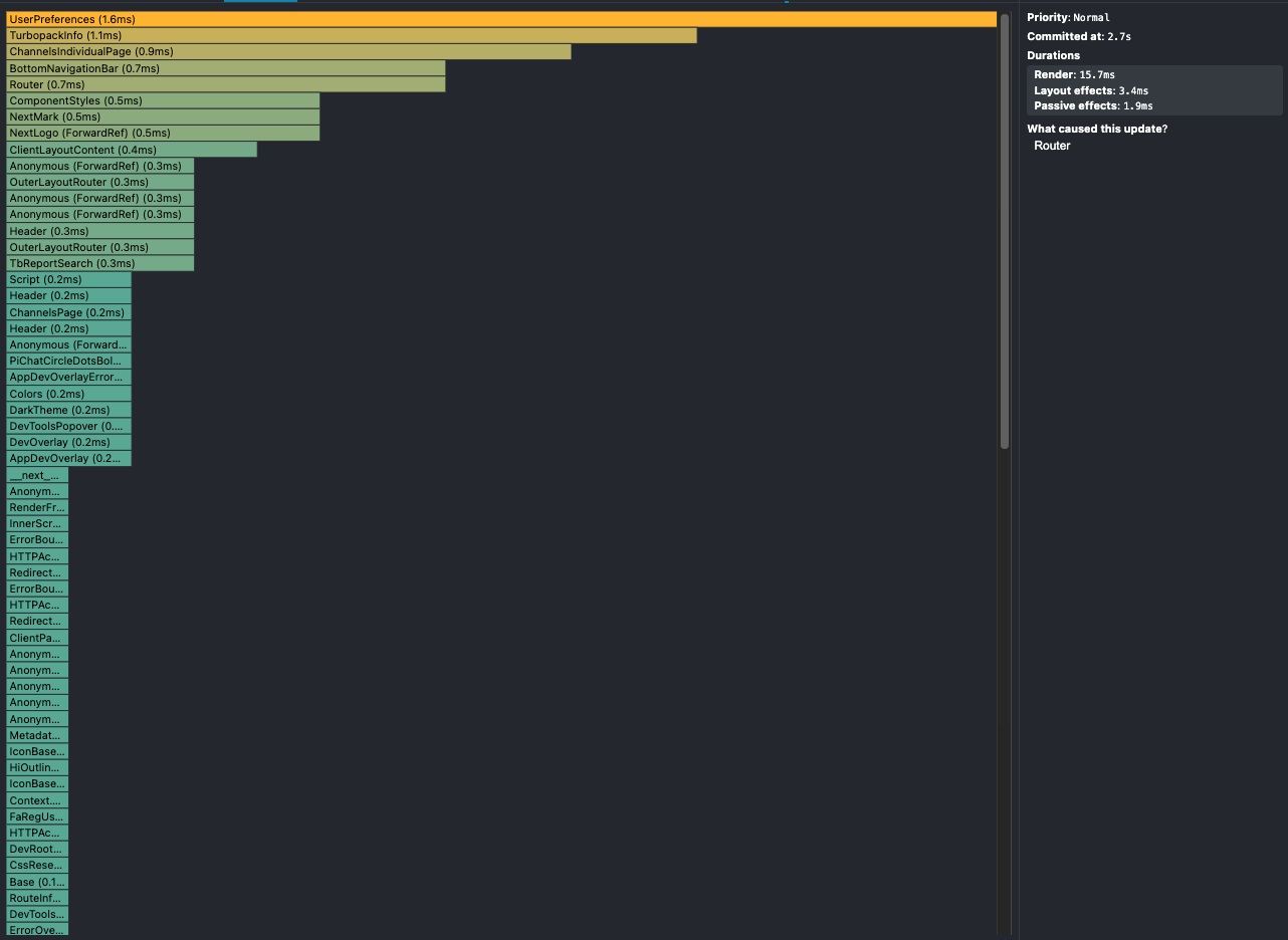 최적화 후 이미지에서는 이전과 달리 특정 컴포넌트들이 개별적으로 렌더링되는 모습이 보이지 않습니다. 대신 전체 렌더링의 총 시간은 이전과 비슷하거나 약간 늘어났지만, 중요한 점은 개별 컴포넌트들의 렌더링 시간이 크게 감소했다는 것입니다. 특히, ChannelIndividualPage와 BottomNavigationBar와 같은 주요 컴포넌트들이 렌더링 목록 상단에서 사라졌습니다. 이는 다음과 같은 방법을 성공적으로 적용해 개선된 것으로 파악됩니다.