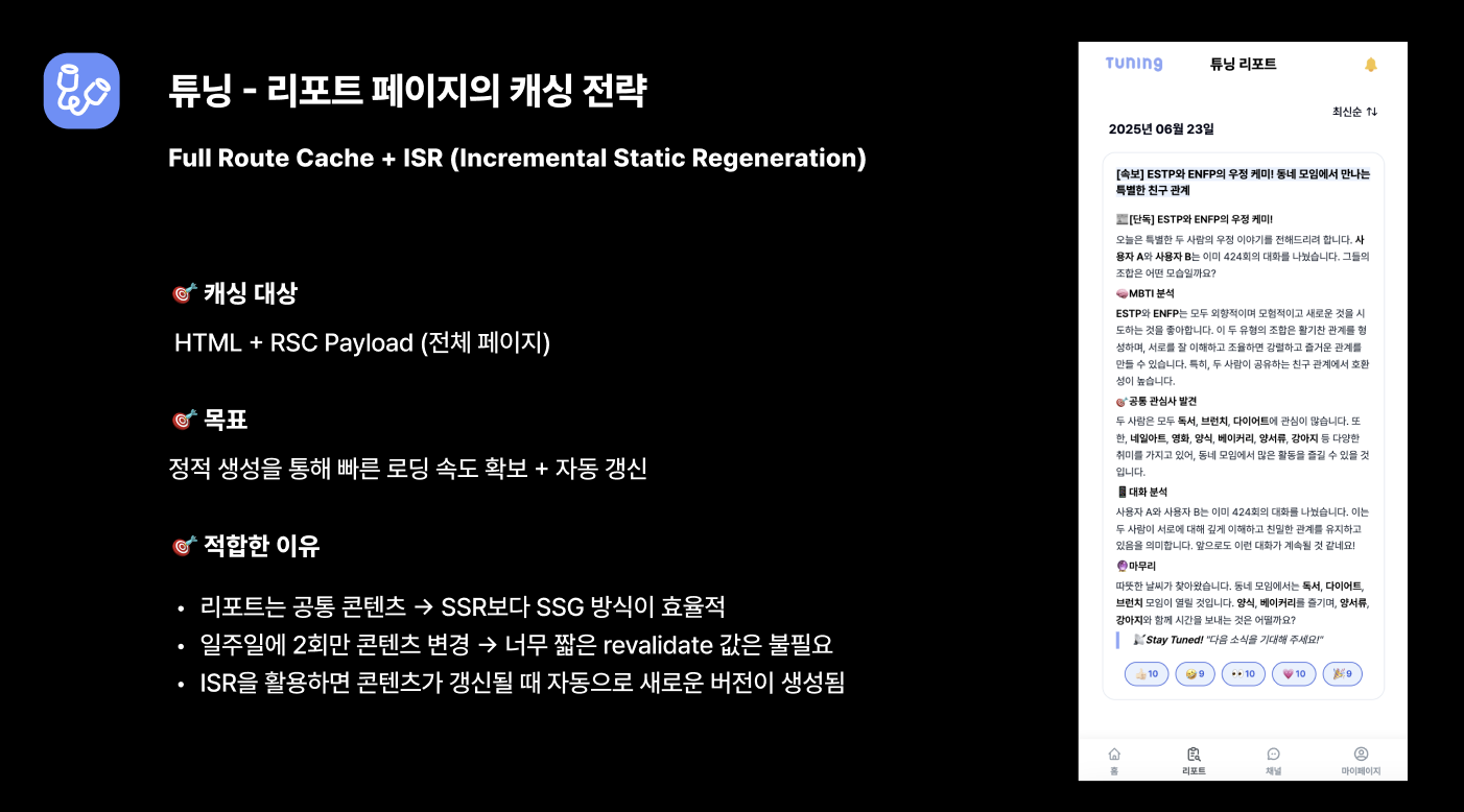 → 따라서 변경이 적고, 모두에게 동일한 콘텐츠를 제공하는 페이지 특성상 Full Route Cache + ISR 전략이 가장 적절하다고 판단했습니다!