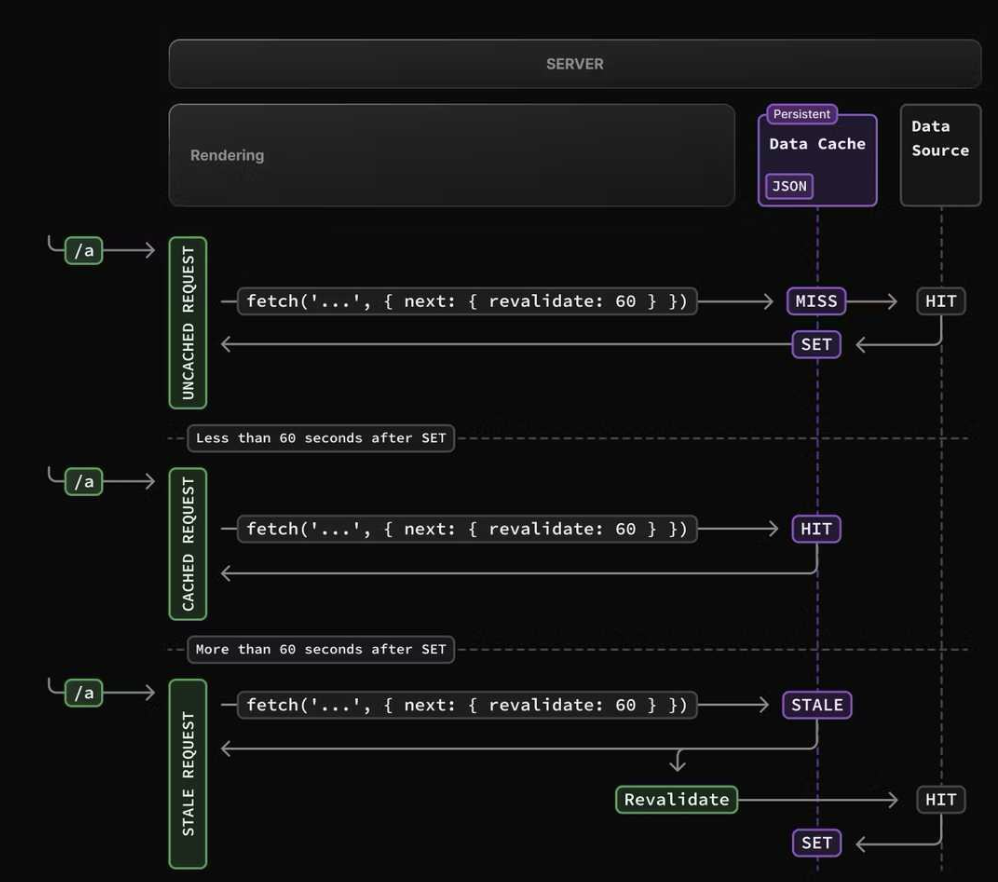 예를 들어, export const revalidate = 60처럼 설정하면 이 페이지는 60초마다 Full Route Cache가 재생성되며, 그 외 요청에 대해서는 캐시된 정적 결과가 그대로 반환됩니다.