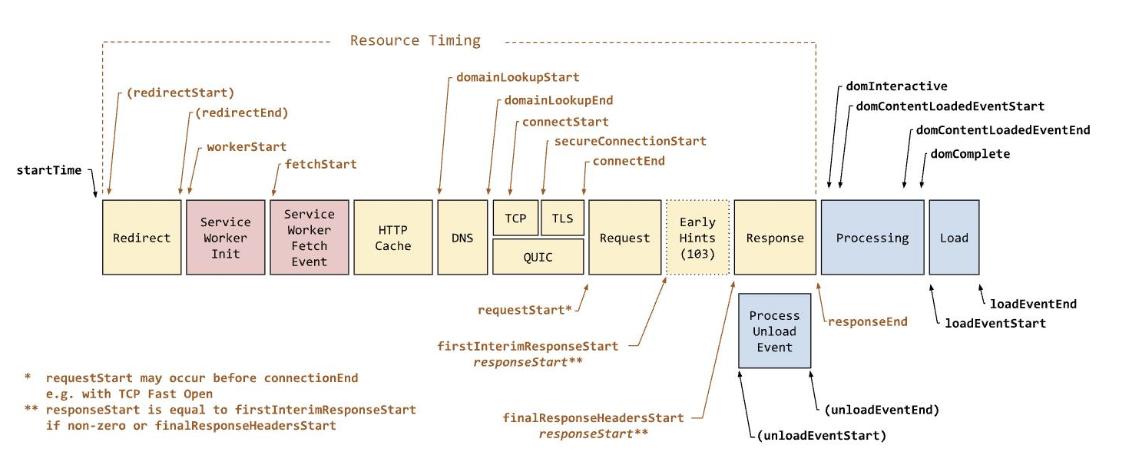 다이어그램에서 노란색으로 표시된 영역이 TTFB에 해당하는 부분인데요, 이 구간은 서버가 얼마나 빠르게 요청을 처리하고 응답을 보내는지에 따라 결정되며 웹 서버의 성능이 직접적으로 영향을 미치는 부분입니다.