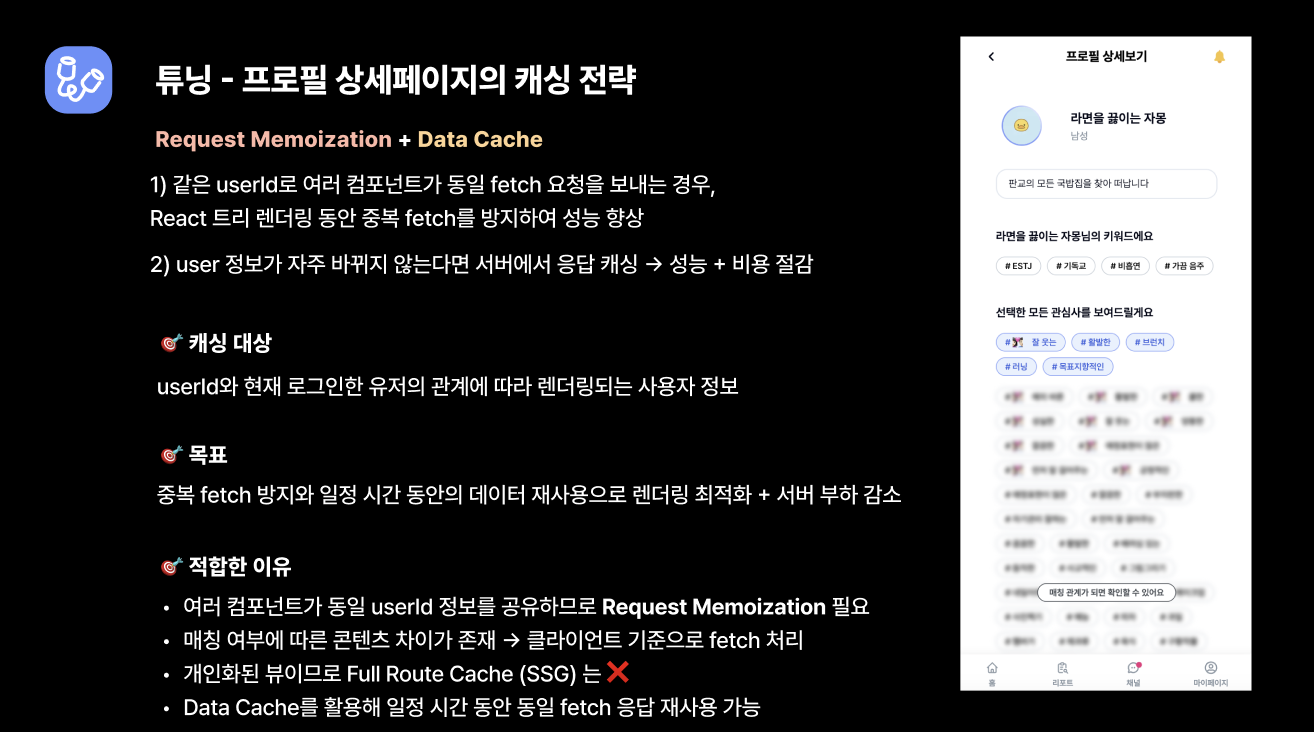 → 따라서 프로필 상세페이지의 특성과 요구사항을 종합적으로 고려했을 때, Request Memoization과 Data Cache의 조합이 가장 적절한 캐싱 전략이라고 판단했습니다.