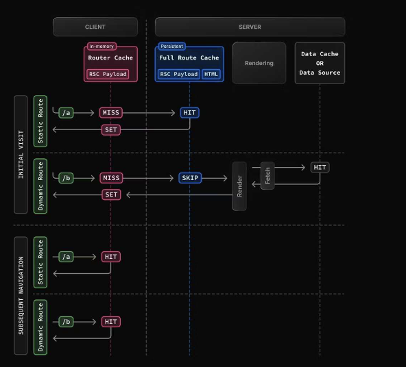| Router Cache | RSC Payload | 클라이언트 | 클라이언트 라우팅 간 동일 데이터 재사용으로 요청 최소화 |
