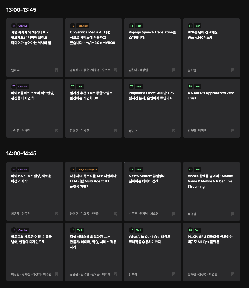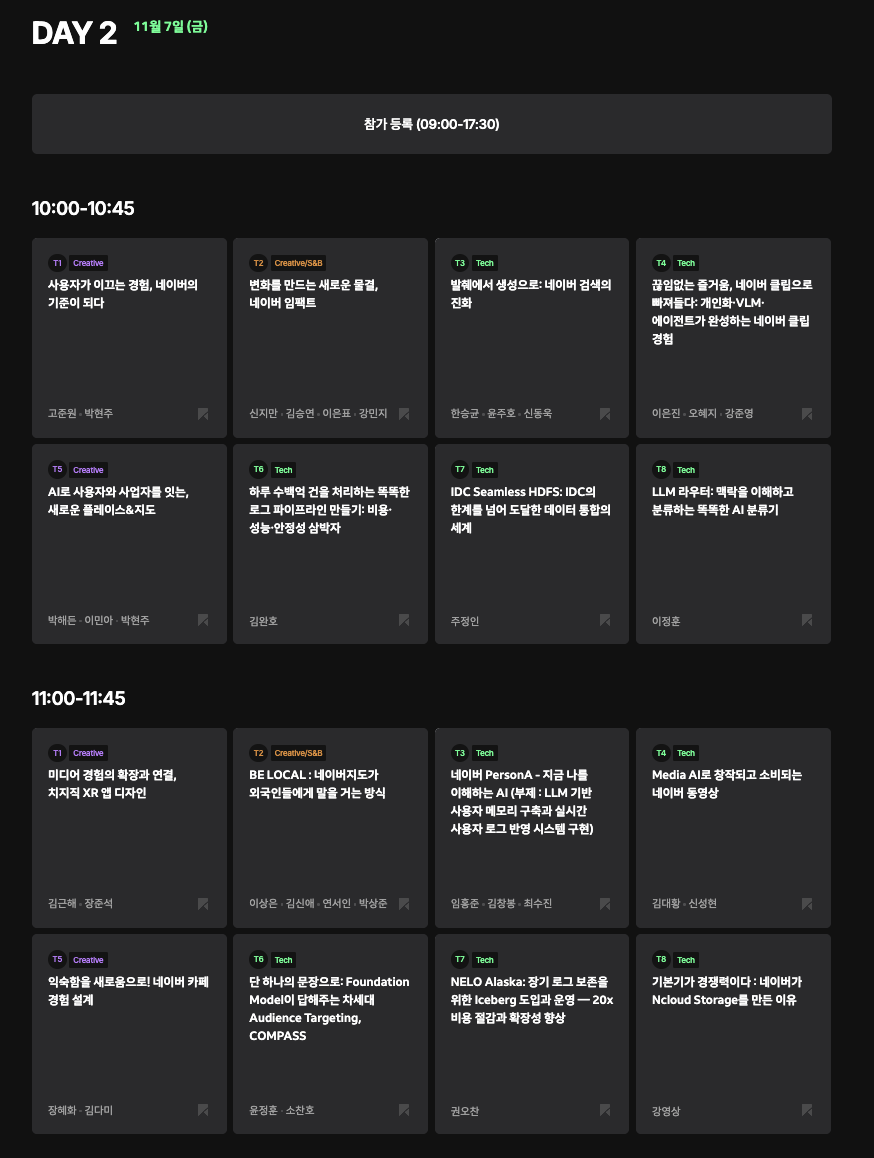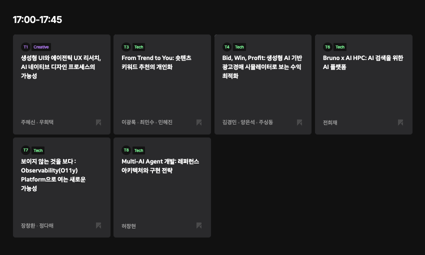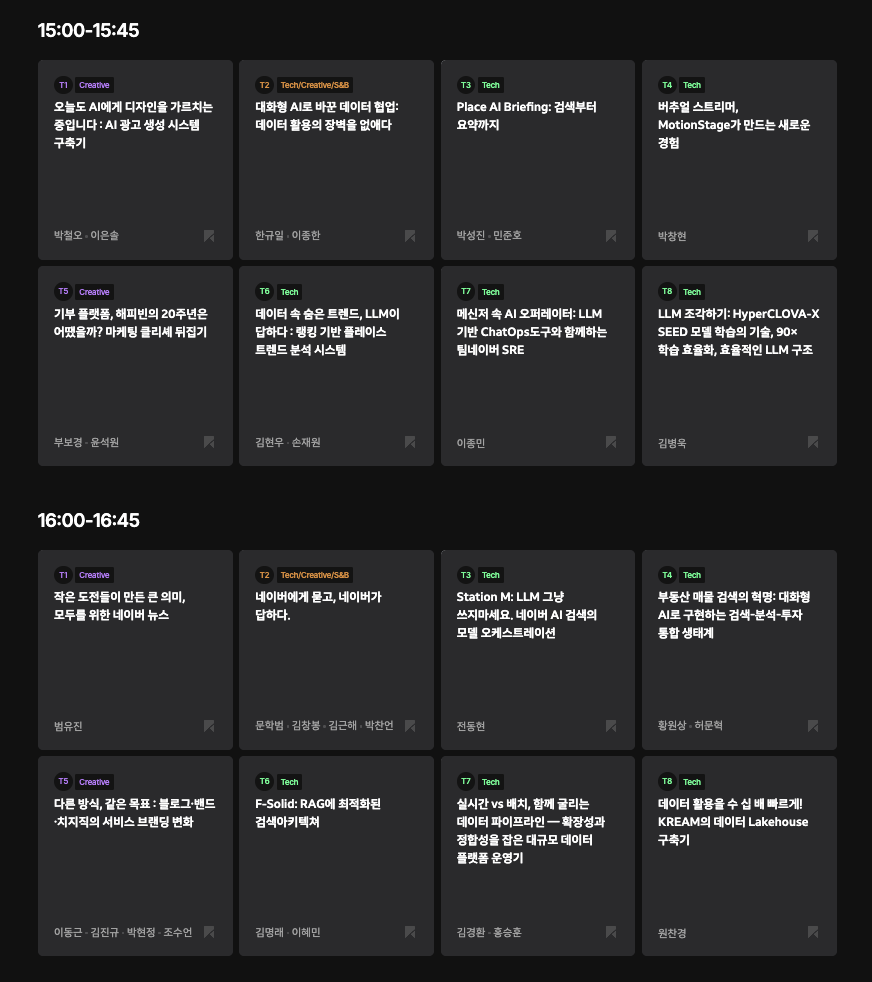 대부분 한 타임 당 8개의 세션이 동시에 진행되기 때문에 유저의 선택지가 많다는 점이 좋았지만 프론트엔드 개발자로서 기획이나 디자인, BE, AI 분야에 대한 세션으로만 구성되었다는 부분이 조금 아쉽다고 느껴졌습니다. 그래서 제가 관심이 있는 백엔드 관련 세션이나 사전 지식이 없어도 가볍게 들을 수 있는 기획, 디자인 세션 위주로 선택했습니다.