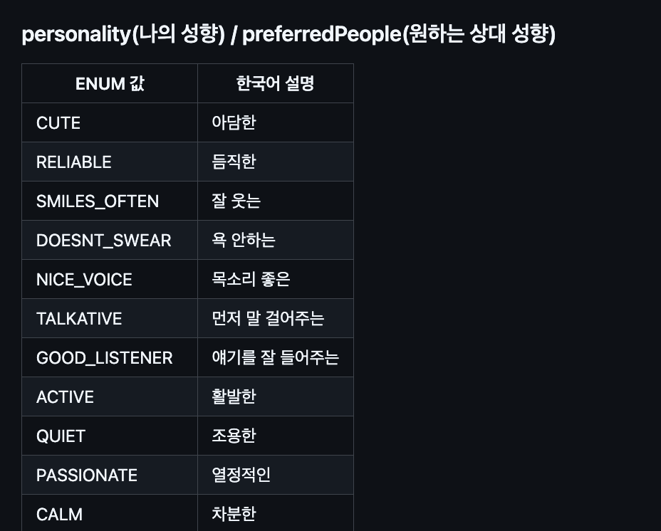 - 이번에 prefix 구조를 도입한 것은 단순한 보완이 아니라 전체 enum 설계를 명확하게 분리해주는 계기가 되었고, 키워드 중 내 성향인 Personality / 선호하는 사람의 성향인 PreferredPeople의 enum 키 - 값이 완전히 똑같았는데, 이 충돌 또한 같이 방지할 수 있는 기반이 되었습니다.